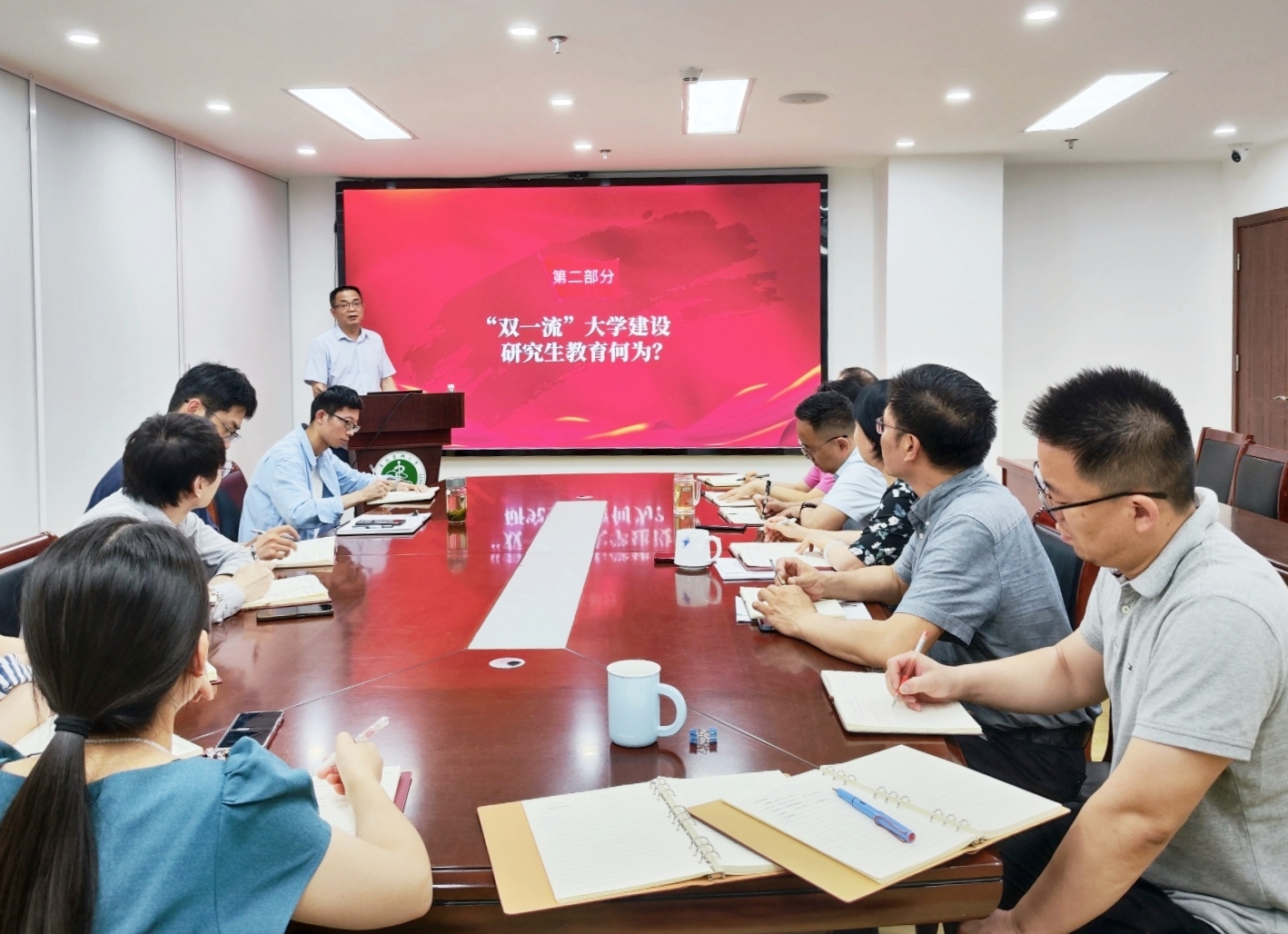 結(jié)合黨代會精神,文育鋒重點(diǎn)部署了未來一段時(shí)期學(xué)校研究生教育高質(zhì)量發(fā)展的關(guān)鍵舉措。他強(qiáng)調(diào),要強(qiáng)基固本,扎實(shí)推進(jìn)博士點(diǎn)建設(shè)與學(xué)位論文質(zhì)量提升,科學(xué)規(guī)劃、精準(zhǔn)發(fā)力,扎實(shí)推進(jìn)學(xué)位授權(quán)點(diǎn)合格評估;要優(yōu)化結(jié)構(gòu),穩(wěn)步擴(kuò)大研究生招生規(guī)模,特別是博士生招生規(guī)模;要深化改革,構(gòu)建培養(yǎng)機(jī)制精準(zhǔn)化、教育生態(tài)智慧化、國際合作常態(tài)化的特色培養(yǎng)模式;要聚焦需求,構(gòu)建高質(zhì)量就業(yè)服務(wù)體系,強(qiáng)化就業(yè)價(jià)值引領(lǐng),完善“招生-培養(yǎng)-就業(yè)”聯(lián)動機(jī)制;要立德樹人,創(chuàng)新導(dǎo)學(xué)思政載體,深化“導(dǎo)學(xué)思政工作室”“師生成長共同體”等特色平臺,營造和諧奮進(jìn)的導(dǎo)學(xué)文化;要關(guān)愛成長,構(gòu)建精準(zhǔn)化心理幫扶機(jī)制,為研究生健康成長保駕護(hù)航;要強(qiáng)化保障,優(yōu)化獎(jiǎng)助體系提升育人實(shí)效,將研究生獎(jiǎng)助的指標(biāo)體系作為學(xué)?!半p一流”建設(shè)的驅(qū)動力;要黨建引領(lǐng),推進(jìn)研究生黨建培育與創(chuàng)建,以高質(zhì)量黨建引領(lǐng)研究生群體全面發(fā)展。