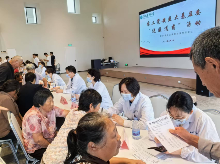 6月7日,農(nóng)工黨安醫(yī)大基層委在黃泊渡村開展“同心安醫(yī)·健康行”活動,通過?現(xiàn)場義診、健康知識宣講以及血糖血壓檢測等方式?,為當?shù)厝罕娞峁┤轿坏尼t(yī)療服務(wù)。活動現(xiàn)場前來就診和咨詢的群眾絡(luò)繹不絕,專家接診臺前排起長隊。農(nóng)工黨安醫(yī)大基層委還向當?shù)厝罕娋栀浟藘r值3000元的常用藥品,切實緩解群眾用藥需求。