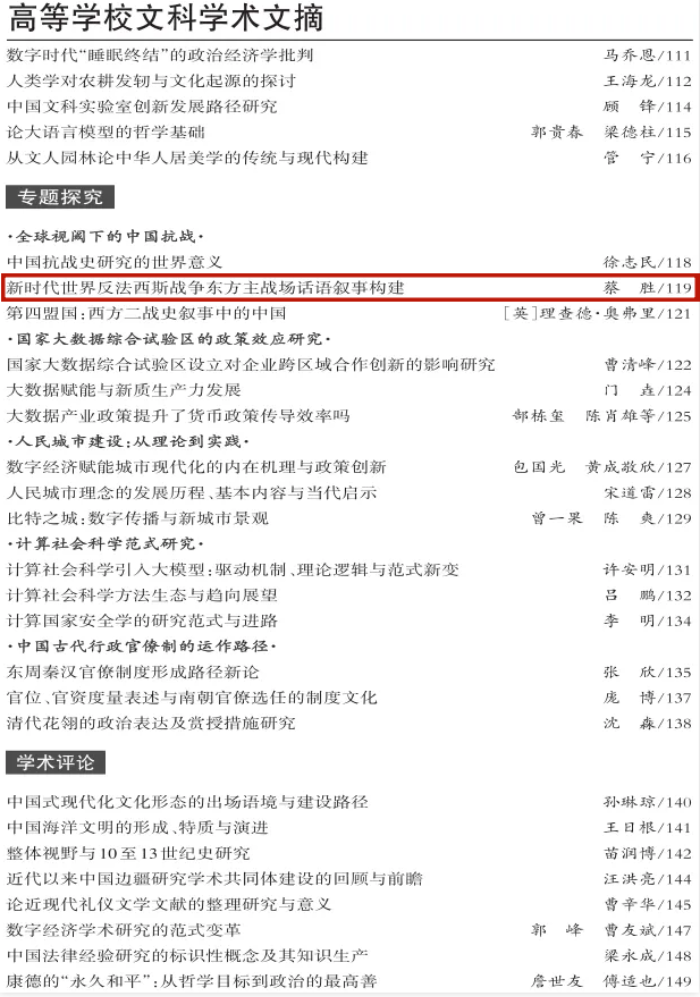 近日,我校蔡勝教授獨(dú)撰的學(xué)術(shù)論文《新時(shí)代世界反法西斯戰(zhàn)爭東方主戰(zhàn)場話語敘事構(gòu)建》獲《高等學(xué)校文科學(xué)術(shù)文摘》2025年第8期全文轉(zhuǎn)載。該文原載于《思想理論戰(zhàn)線》2025年第4期。